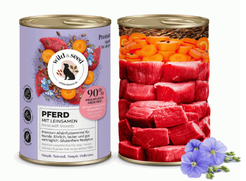 Cheval (90 % composé de 60 % de viande musculaire, 22 % de poumon, 11 % de cœur, 4 % de cou, 2 % de foie), carottes (5 %), graines de lin (4 %), minéraux (1 %).