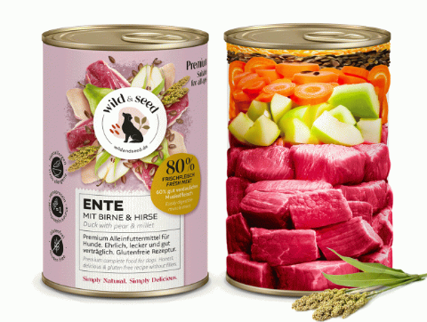 Ingrédients : Viande de canard (80 %, dont 60 % de muscle, 19 % d’estomacs, 12,5 % de cœurs et 8,5 % de cous), carottes (11 %), millet (3 %), graines de lin (3 %), poire (2 %), minéraux (1 %).